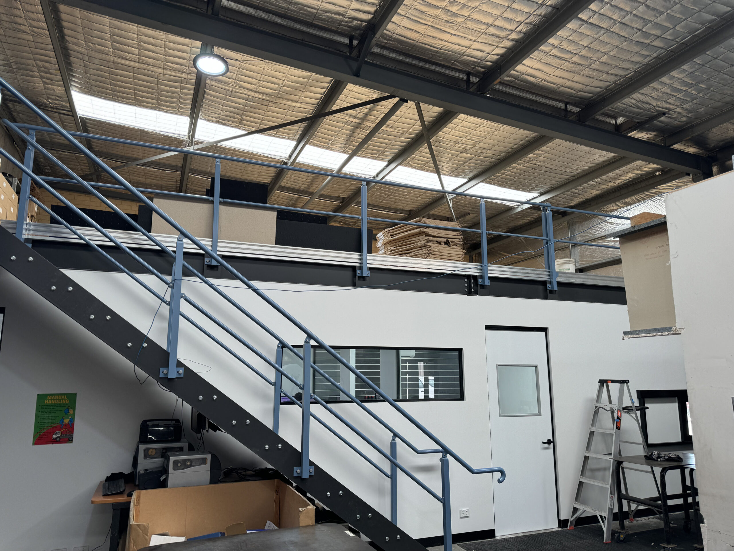 This project included full council approvals, a custom steel frame mezzanine, tongue and groove plywood floor, steel chequer plate stair, compliant safety rail, pallet access gate, insulated steel-stud and Gyproc walls, Gyproc and glass walls, T-bar grid and tile ceiling, commercial carpet tiles, polished concrete floor, recladding to part of the external building, custom awning structure, and painting.